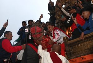 The idol of Rato Machhindranath, worshipped as the deity of rain and prosperity, was ceremoniously installed in its chariot as per time-honored tradition today in Lalitpur. Accompanied by traditional music and the revered Guruju’s platoon, the idol was transferred from the temple in Ta Bahal, Lalitpur, and placed onto a palanquin before being enthroned in the 32-hand-long chariot currently under construction at Pulchowk.