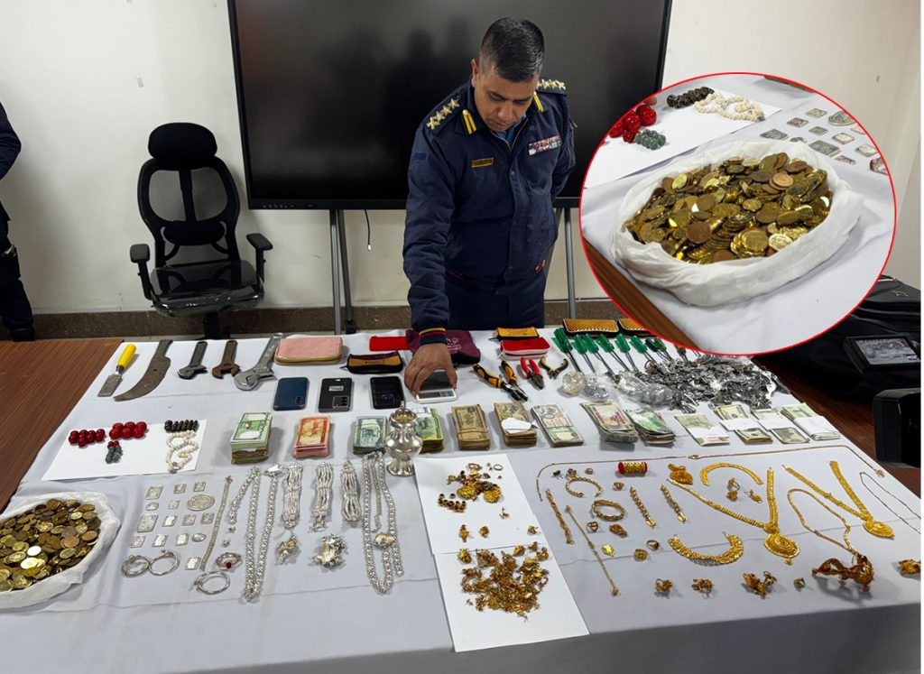 Late Thursday night, Kathmandu police opened fire to arrest Prem Chaudhary of Banke at Nagarjun Municipality–6, Mahankal, recovering 65 tolas of gold, silver, cash, and homemade weapons.