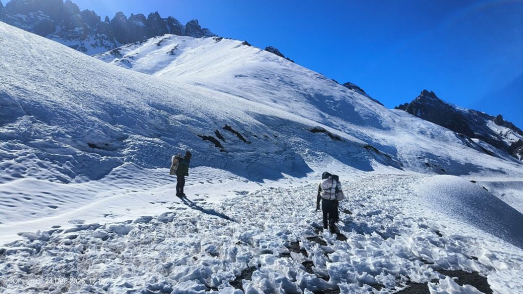 The trekkers were seen walking along snow-blanketed sloping roads in in Baragung Muktikshetra Rural Municipality.