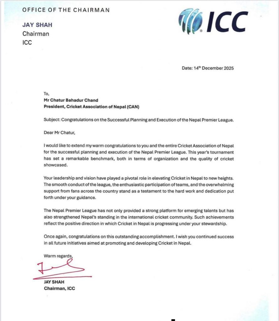 ICC Chair Jay Shah has dispatched a letter to CAN Chair Chatur Bahadur Chand, congratulating the CAN for the event. Shah also expressed his hope that the CAN would take a new height under the leadership of Chand.