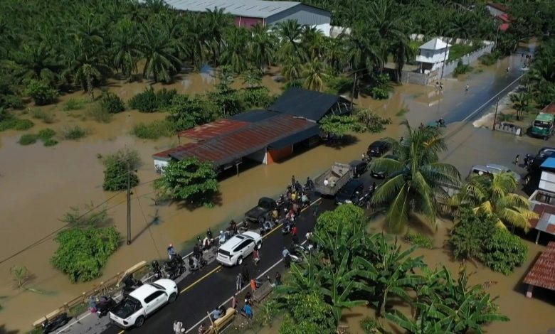 Drone images reveal streets and houses submerged under floodwaters, while rescue teams continue efforts to evacuate residents and provide emergency assistance.
