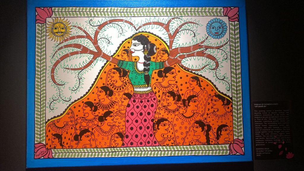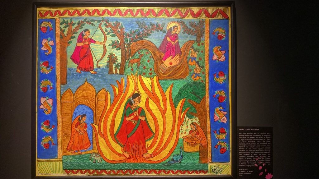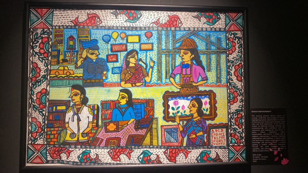 Organized by “Maiti Nepal”in collaboration with Gallery 108, the showcase features 15 carefully curated artworks. Each piece serves as a bridge between the centuries-old Mithila tradition and contemporary social justice. While the style remains rooted in the intricate patterns and symbolic geometry of Madhubani art, the subject matter is a stark, necessary departure.
