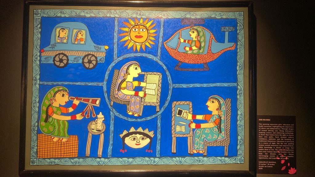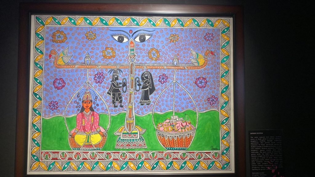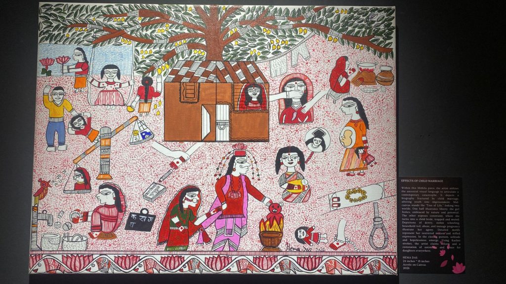 The exhibition “Hamro Sahas, Hamro Kala” (Our Courage, Our Art) is more than just a collection of Mithila paintings; it is a visual manifesto against the archaic shadows of dowry and child marriage that still haunt the Madhesh region.