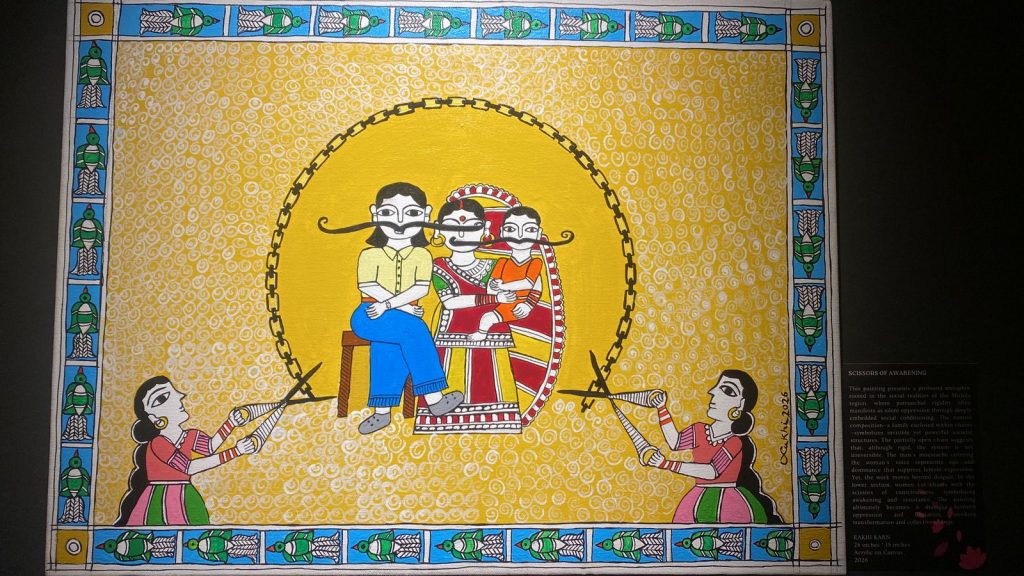 Walking through the gallery, visitors are met with scenes that demand attention. One canvas depicts a young girl’s childhood being severed by the heavy chains of marital expectation, while another illustrates the “Scissors of Awakening” a powerful metaphor for women reclaiming their voices.