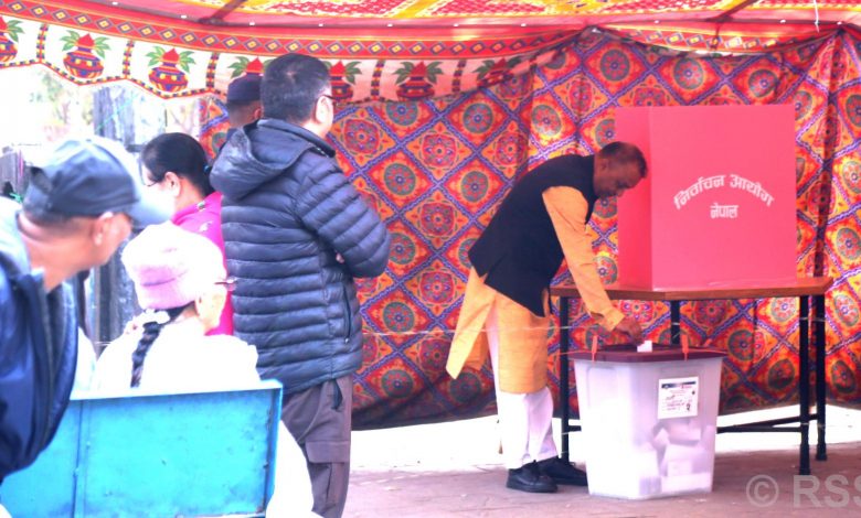 Nepali Congress President Gagan Kumar Thapa, exercised his right to vote at the Mayurkunda Polling Centre at Maitidevi Temple in Kathmandu.