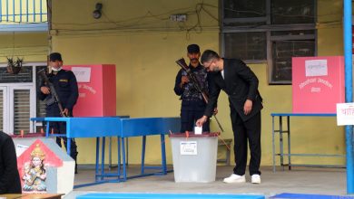 Nepali Congress President Gagan Kumar Thapa, exercised his right to vote at the Mayurkunda Polling Centre at Maitidevi Temple in Kathmandu.