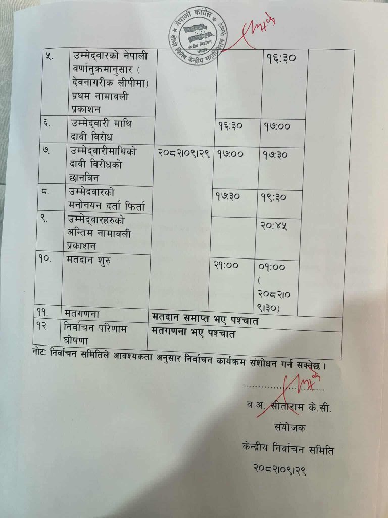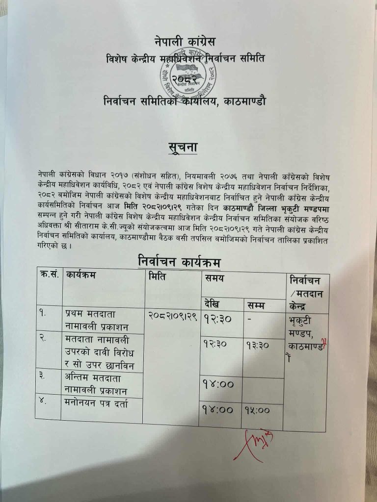The closed camp of Nepali Congress’s ongoing 2nd Special General Convention has published the schedule for the election to choose the party’s new leadership.