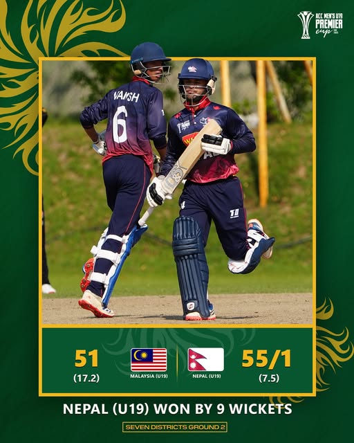 Nepal secured a berth in the Asia Cup, defeating Malaysia by nine wickets in today’s semifinal match of the ICC Men’s Under19 Premier held at Ajman Stadium in the United Arab Emirates (UAE).