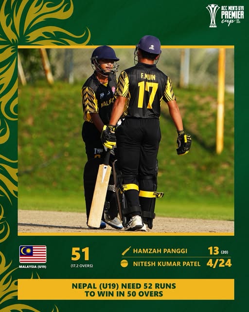 Nepal chased down the target of 52 runs set by Malaysia in 7.5 overs for the loss of one wicket.