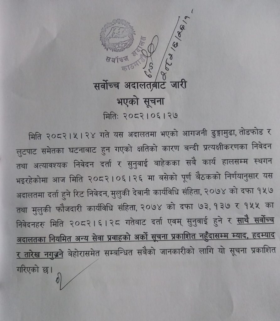 Spokesperson Arjun Prasad Koirala says that the Apex Court is resuming full-fledged operations including the registration of all types of writ petitions, continuation of hearing procedures and the acceptance of petitions under Sections 157, 73, 137 and 155.
