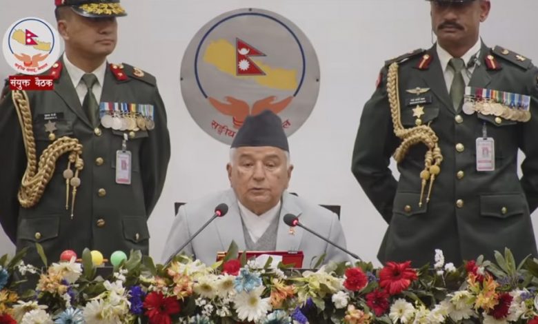 President Paudel addressed to the joint sitting of lower house and upper house of the Federal Parliament at the recommendation of the cabinet in accordance with Article 95 of the Constitution of Nepal.