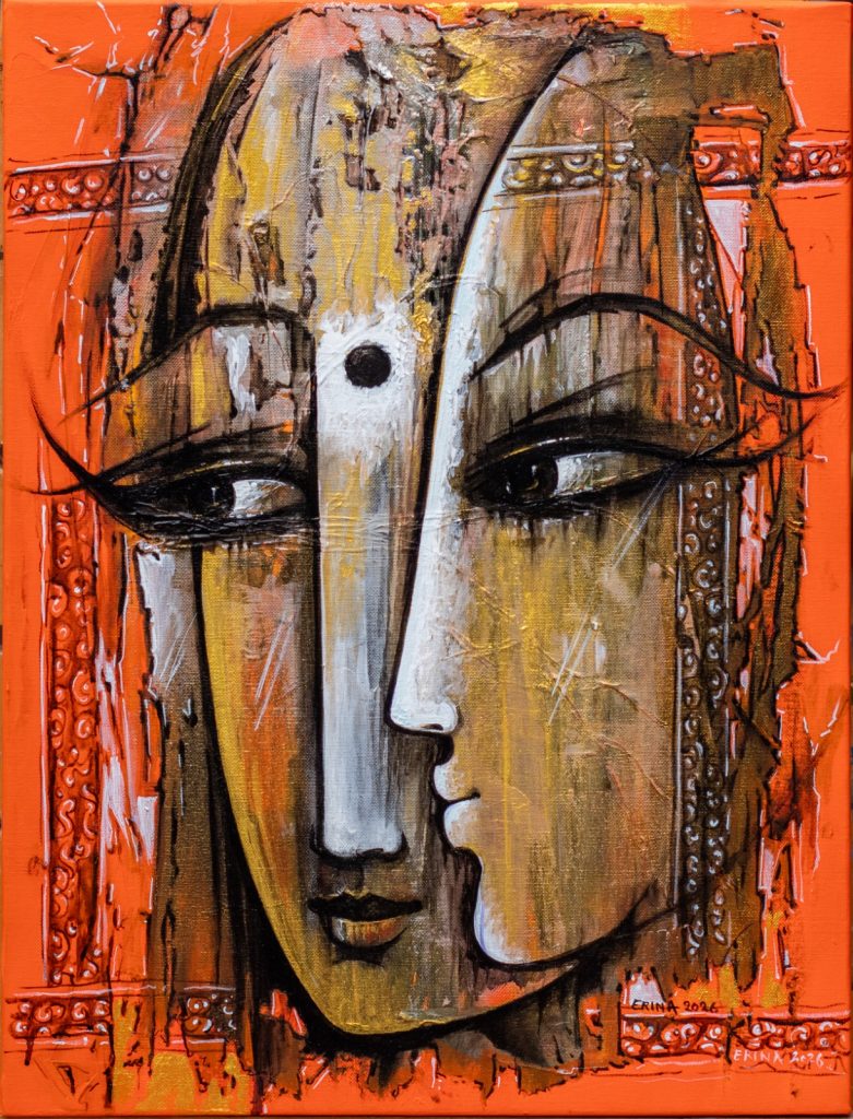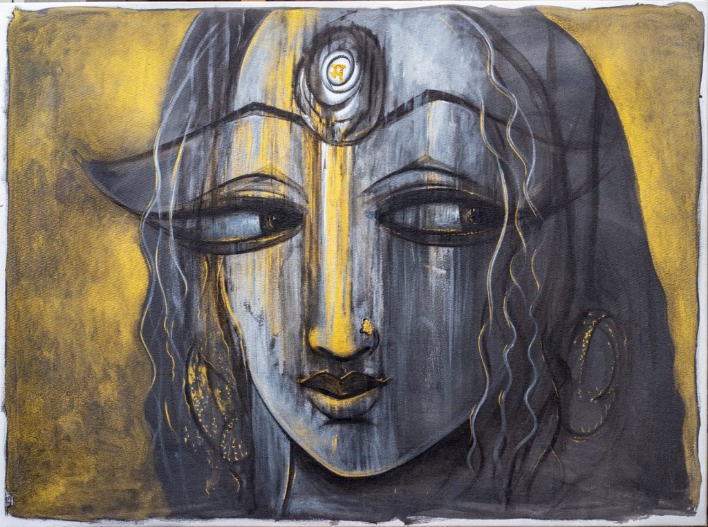 However, this silence is coupled with the commanding presence of the Third Eye. While the physical eyes look inward, the Third Eye asserts authority, presence and enlightenment. It is a “state of seeing beyond the ordinary”, bridging the gap between the deeply personal and spiritual. As Tamrakar notes in her artistic statement, this eye represents an evocation of psychological imagery that challenges how we perceive power.