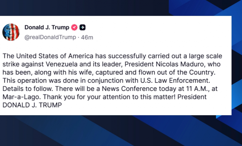 US President Donald Trump says in a post on Truth Social that US forces have captured Venezuelan leader Nicolas Maduro after launching a “large scale strike” on the South American country.